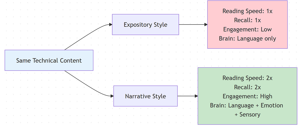 Studies back this up. A massive 2021 meta-analysis covering over 33,000 participants found that stories are significantly easier to understand and recall than expository essays [3]. Narrative text gets read about twice as fast as expository text. It gets recalled twice as well too [4]. Not 10% better. Twice. That’s not a marginal improvement. That’s a completely different league of effectiveness. And this isn’t just for non-technical topics. It holds true whether you’re explaining how cookies work or how Kubernetes schedules pods [4].