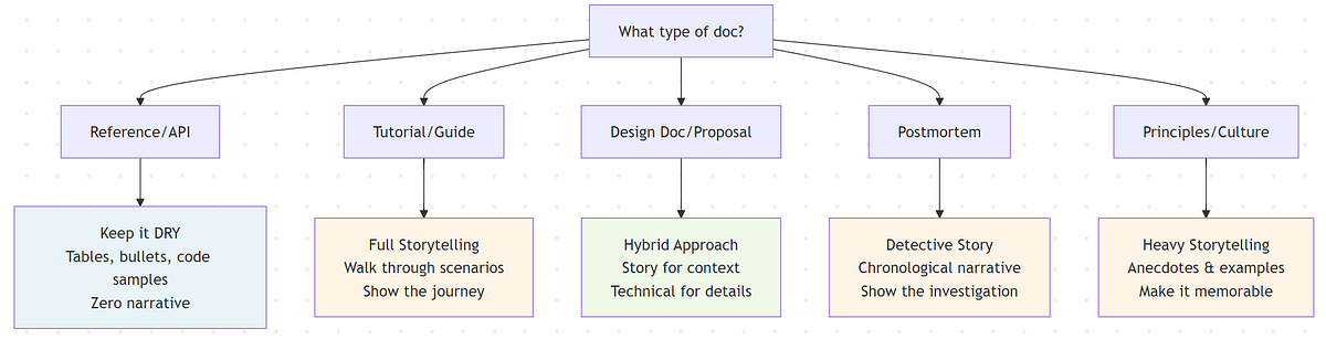 Design docs and architecture explanations live in the middle. They need technical precision, but they also need to convince people. I’ve seen brilliant designs shot down because the author couldn’t explain why anyone should care. Start with a story. “Here’s the problem we’re facing. Here’s what happens if we do nothing. Here’s what we’re proposing.” Then dive into the technical details. Then bring it back to impact. Sandwich the dry stuff between layers of narrative context.
