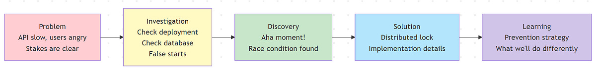 The structure was: problem (slow API, angry users), investigation (the detective work), discovery (the aha moment), solution (the fix), and learning (how we prevent it next time). That’s a story arc. It’s also just… good documentation. It shows causality. It shows process. It makes the lesson stick.