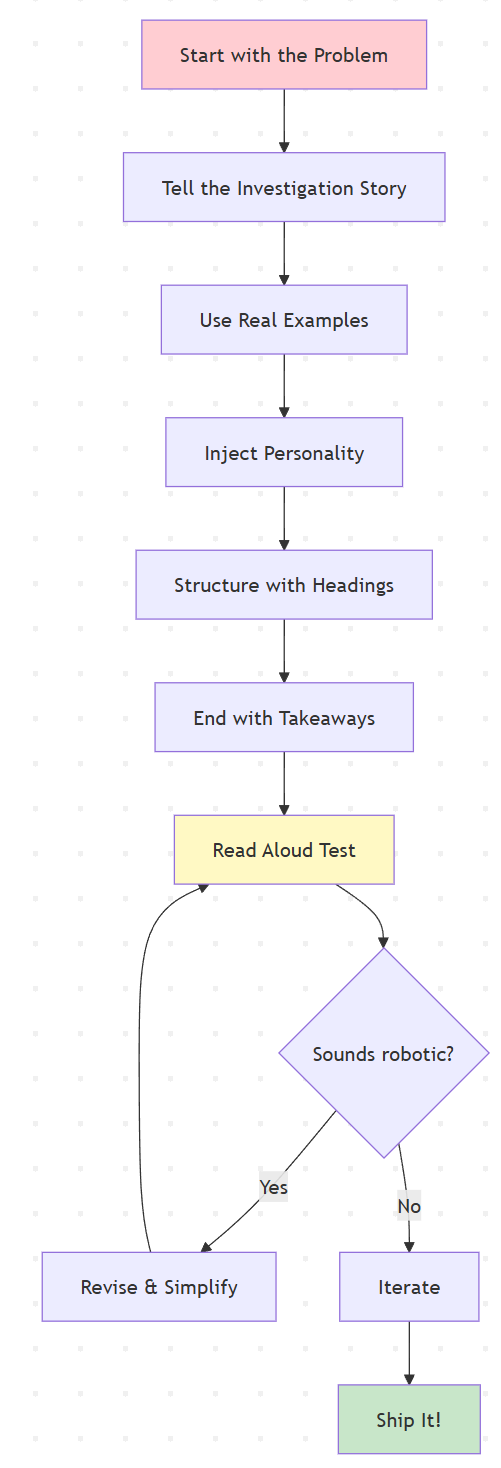 Next time you sit down to write a design doc or tutorial, try this: start with a real problem, walk through your thinking process, use specific examples, and write like you’re talking to a smart colleague. See how it feels. I bet it’ll be better than what you would’ve written otherwise.